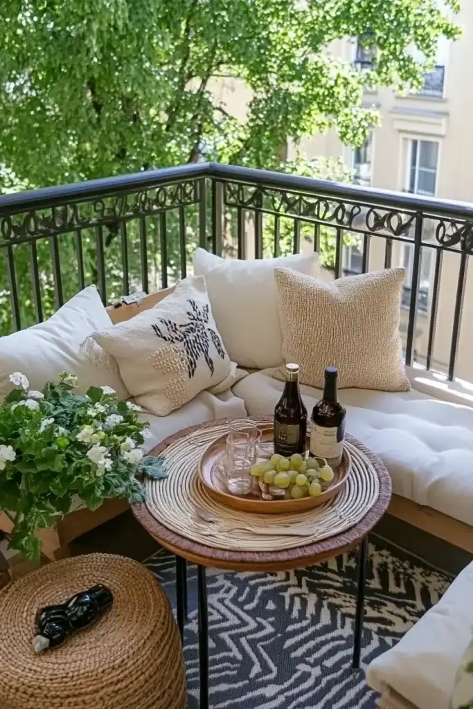 🔹 Keyword variation: boho small balcony decor, cozy floor seating ideas