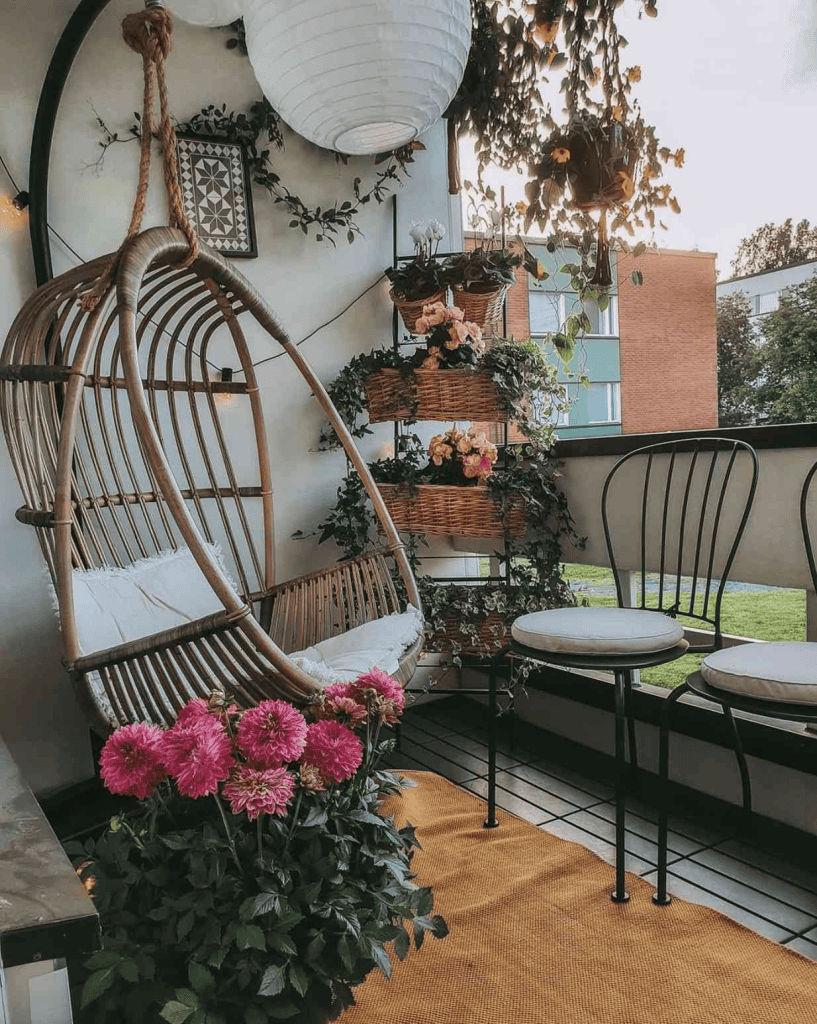If your ceiling or overhang allows, a hanging egg chair or hammock swing turns your balcony into a cozy escape.
