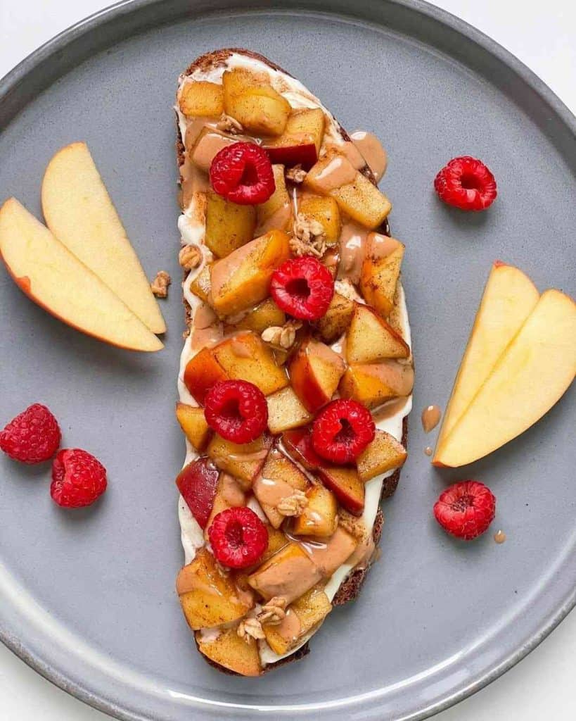 Sauté apples in butter until soft and golden. Sprinkle with cinnamon and a pinch of sugar. Spoon onto toast and enjoy warm.
