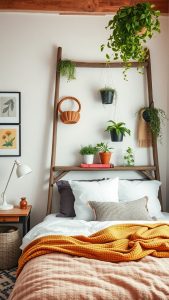 A ladder headboard brings a unique touch to your bedroom. It’s not only stylish but also functional, offering a place to hang fairy lights or your favorite decor items. Plus, it’s an easy DIY project that adds character without breaking the bank.