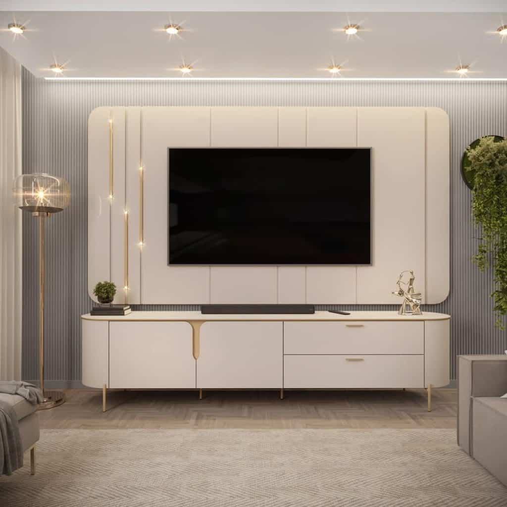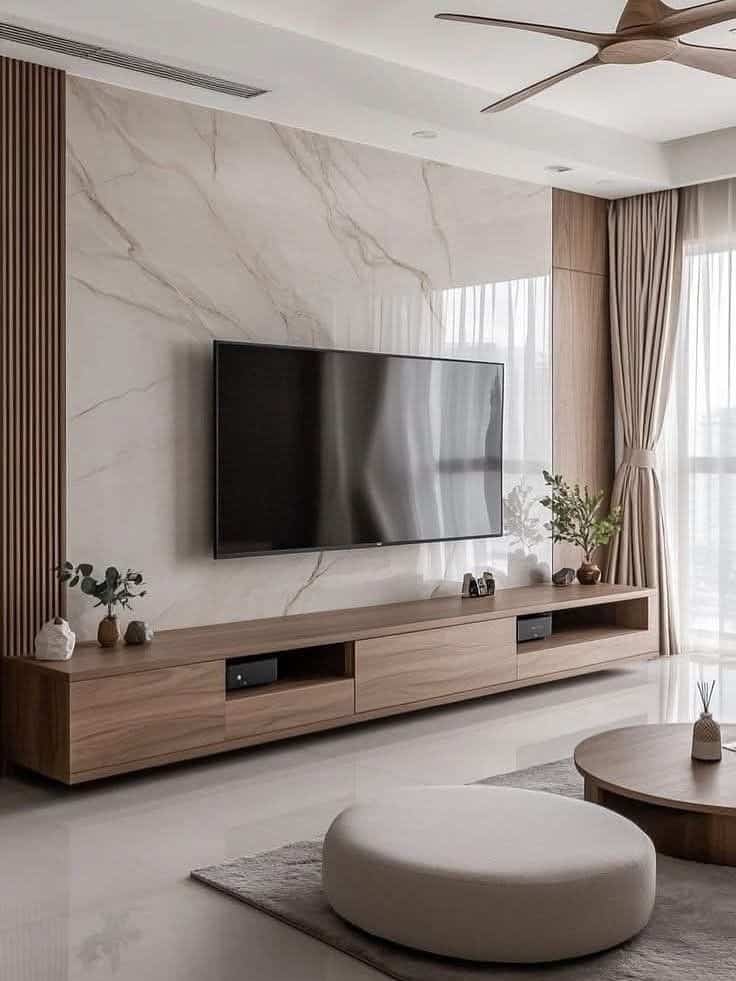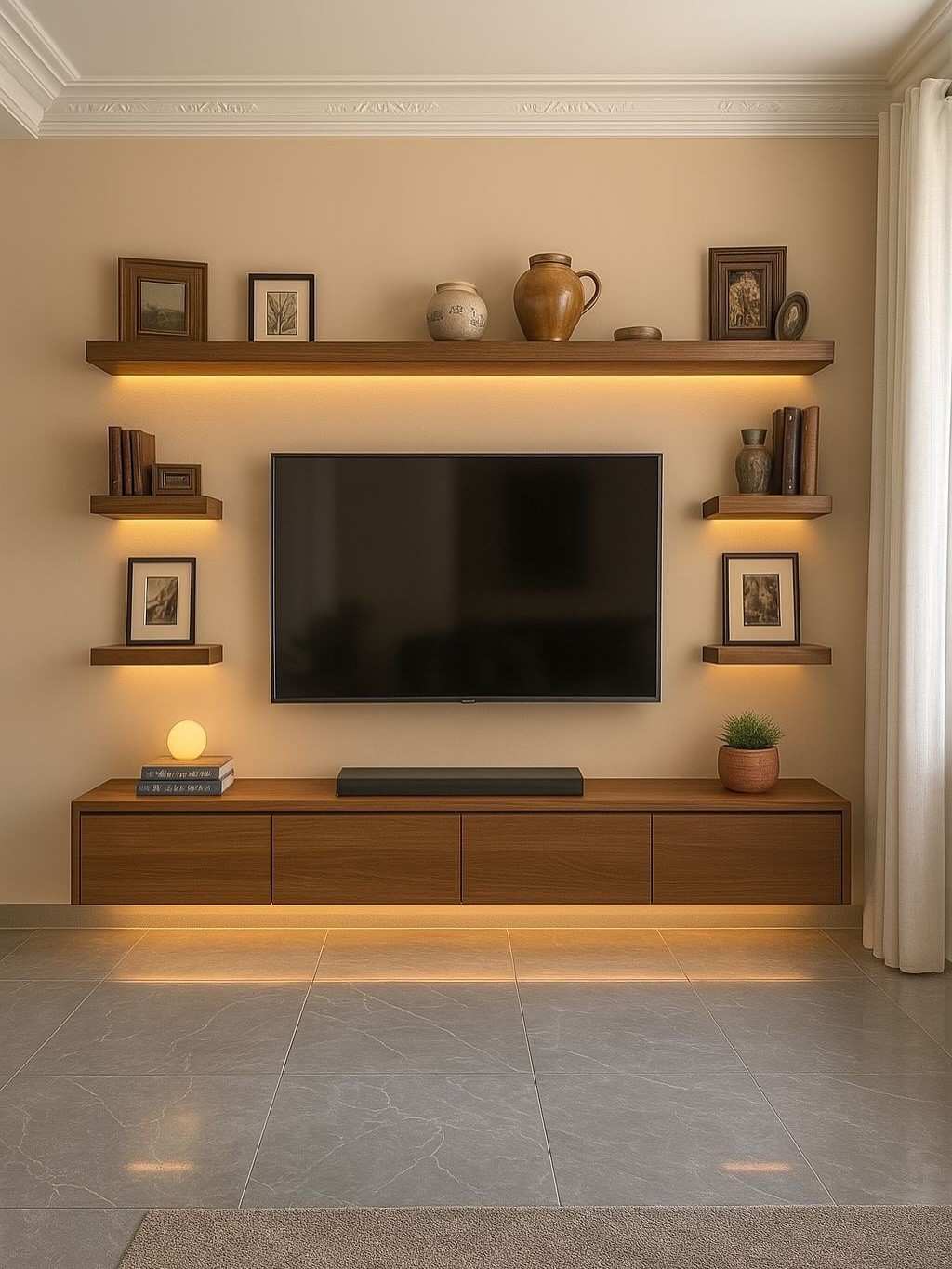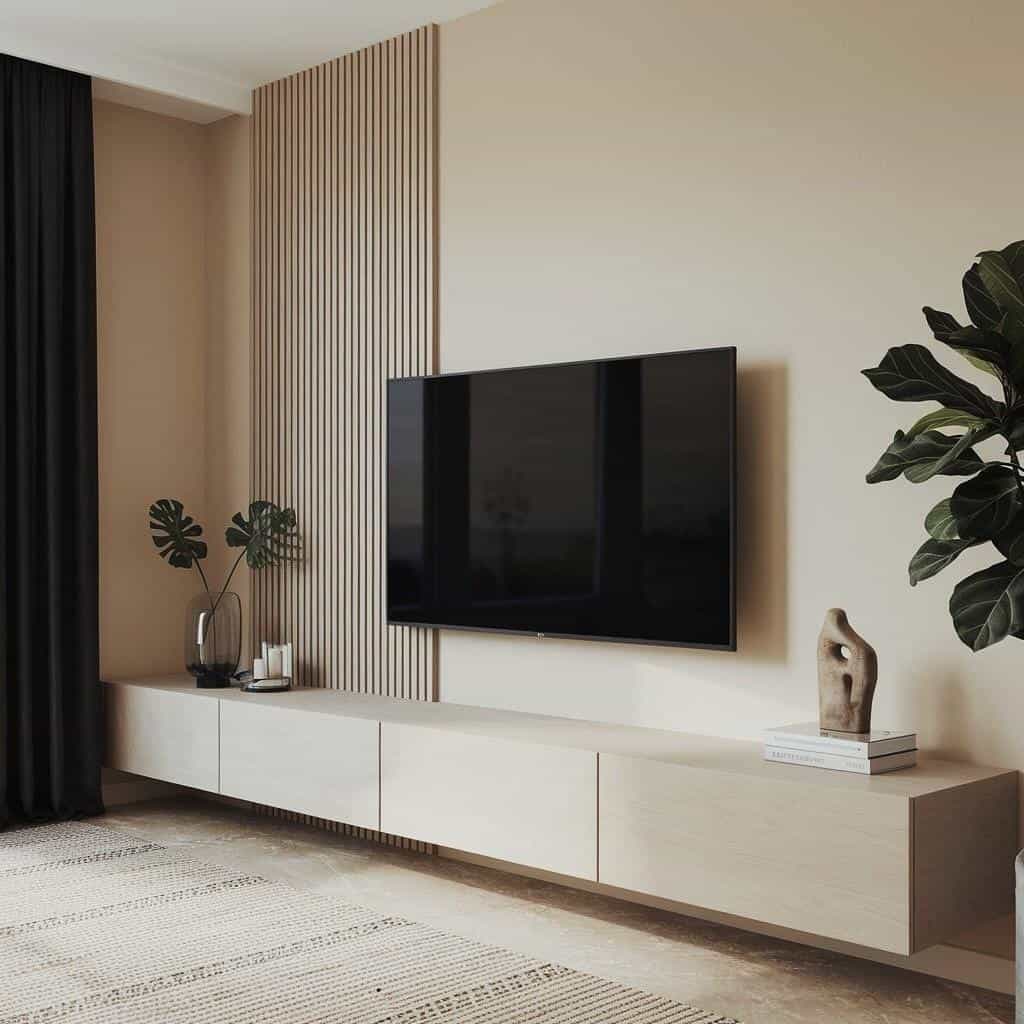Choose a sleek media console and add just a few decorative items like plants or vases to create balance. This minimalist style ensures your TV remains the focal point without overwhelming the room.