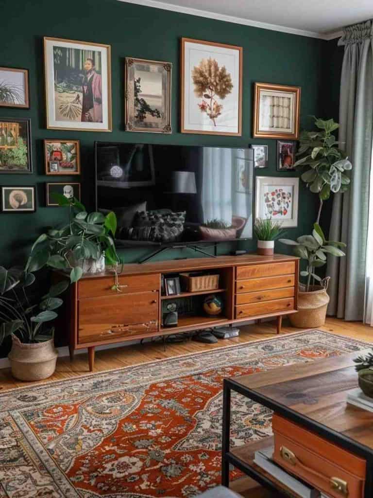 Hang a mix of photos and artwork around your TV for a cozy vibe that reflects your style.