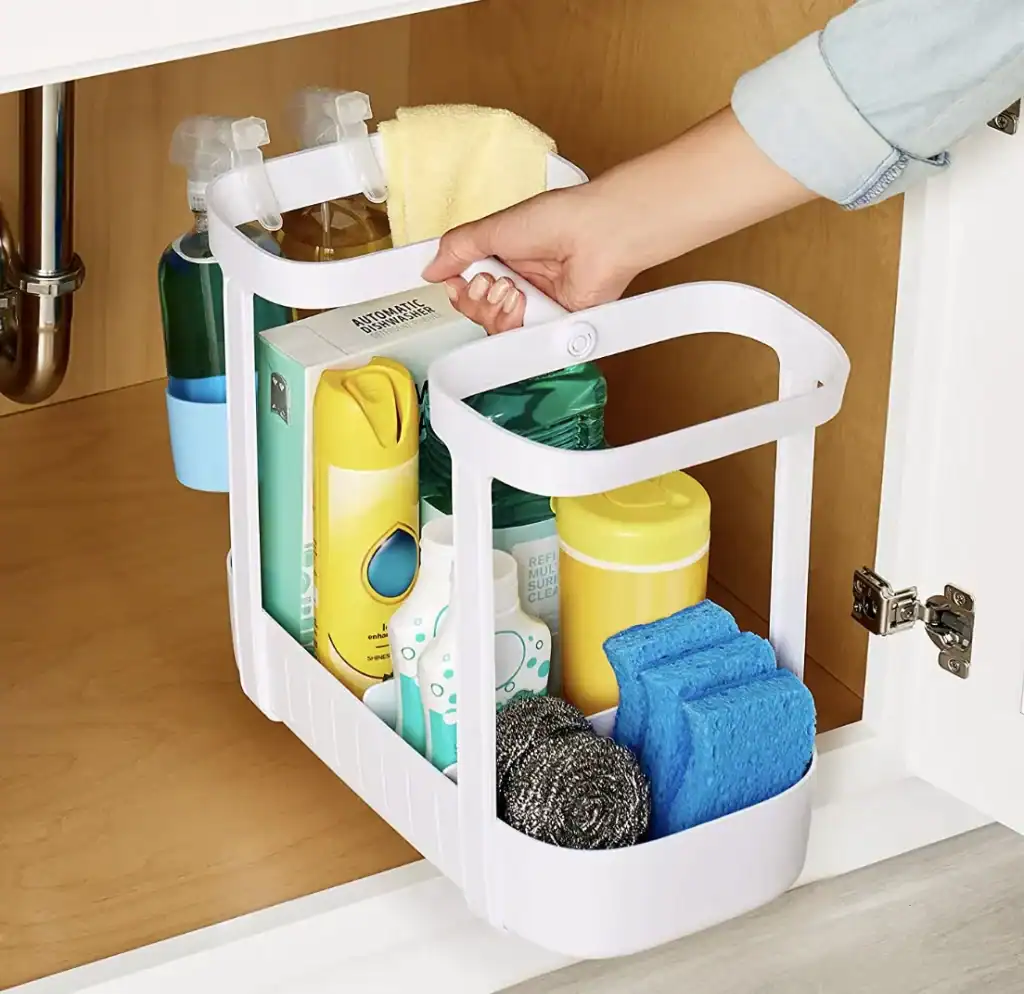 The caddy should be in the middle zone. It needs to be easy to grab with one hand and not too big to fit comfortably under the sink when you aren’t using it. A simple rectangular plastic caddy with a handle is perfect – you don’t need anything fancy.