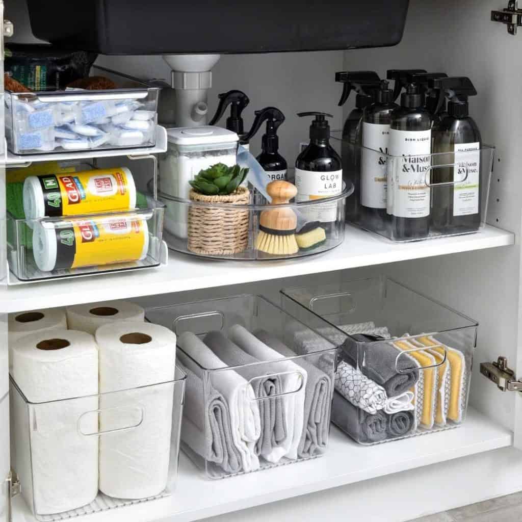 Decanting – transferring items from their original packaging into matching containers – is popular in organisation content, and with good reason. But under the sink, it needs to be done carefully – not to everything.
