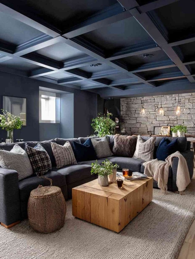 Instead of hiding imperfections, make the ceiling a statement piece. Deep navy, charcoal, or even forest green can give the basement personality.