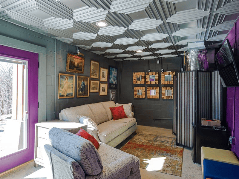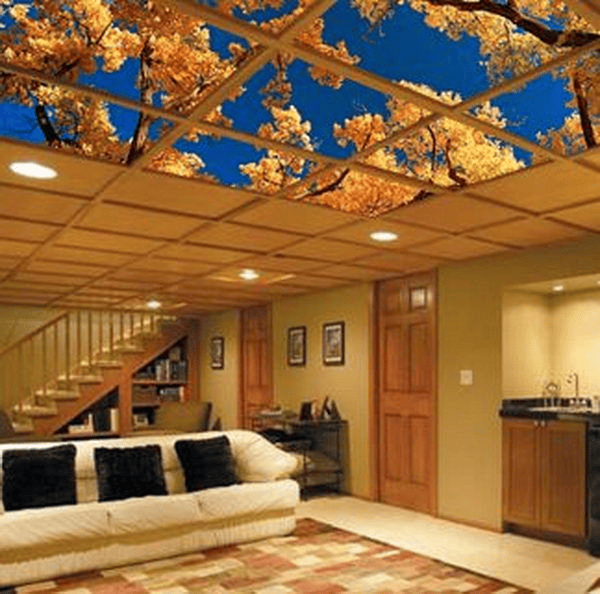 Transform your basement into a creative escape with a painted mural on the ceiling. It could be a night sky, forest canopy, or abstract art.