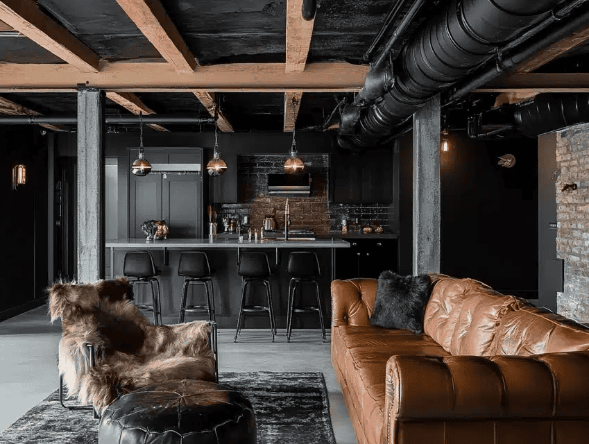 If your basement already has visible ductwork or piping, lean into the look. Paint pipes matte black or metallic for an intentional industrial style.