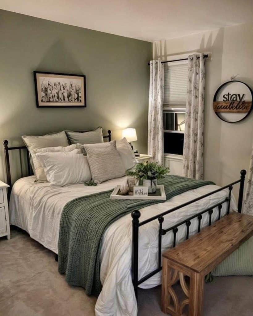 Sage green has quietly become a bedroom favorite, and for good reason. It’s soft, natural, and doesn’t overwhelm your senses. When paired with an off-white (not bright white), it feels balanced and breathable.