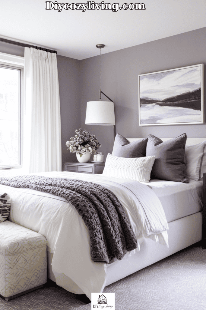 Gray bedrooms often feel cold — unless you warm them up. A warm gray (think greige, not concrete) paired with blush or muted pink accents can completely change the atmosphere.