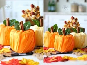 This DIY is perfect if you love cozy textures. Simply wrap pumpkins in fabric to give them a soft, elegant look. Plaid flannel creates a casual, rustic feel, while velvet or satin makes them look high-end.