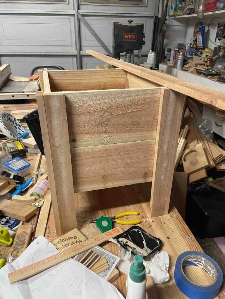 At this point the box already looks like a planter. A plain, unfinished planter, but unmistakably the right shape. Marina came out at this point and declared it beautiful. She is an excellent audience.