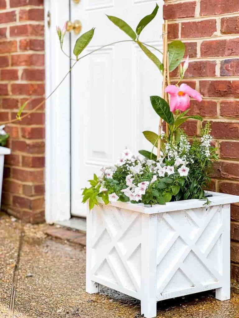 If you want to age the look rather than keep it crisp white — a light sand after the final coat of paint, followed by a coat of clear wax — gives the planter a slightly worn, vintage finish that looks beautiful on a rustic porch.