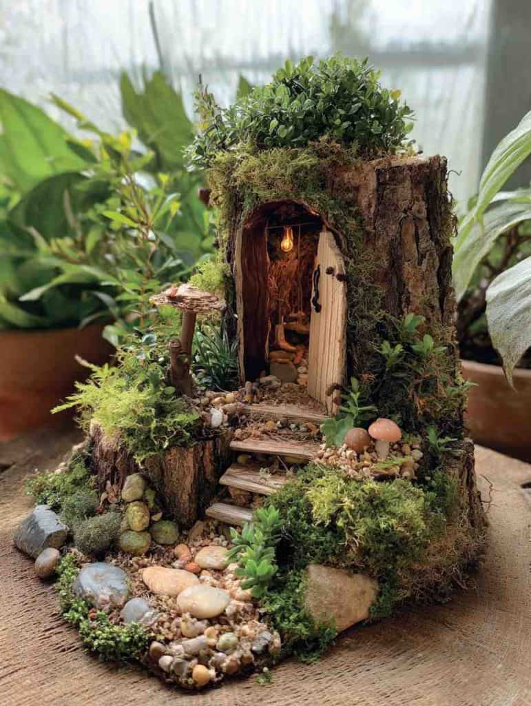 Using a tree stump as a base immediately grounds your garden in reality. Hollow the top slightly or carve a door into the side to create a miniature home. Scale is crucial: small doors, tiny furniture, and moss around the base make the home believable. Add tiny steps or a winding moss path to integrate it naturally with the surrounding landscape. Imperfections — like slightly tilted doors or uneven bark — enhance charm.