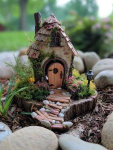 - Houses and doors: Start with your main structure. Ensure its scale matches the rest of the elements. Tiny fairy doors can be tucked into moss-covered rocks, tree stumps, or the sides of containers.