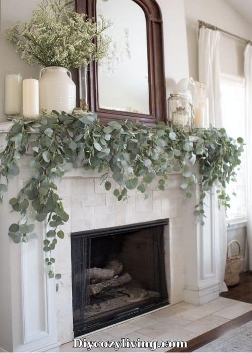 A long eucalyptus garland, faux or real, draped across the mantel instantly says spring. No signs. No bunnies. No florals exploding everywhere.