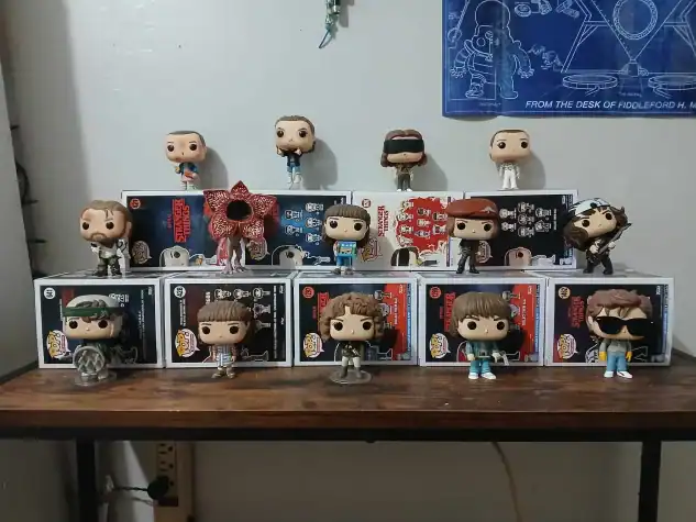 This took a while. She moved them, stood back, moved them again. Eleven at an angle. The Demogorgon at the back because he’s the tallest. The others in a line she adjusted several times until something about it satisfied her.