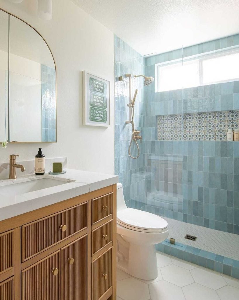 For Smaller Spaces: Use darker tiles only halfway up the wall, then switch to a lighter tone. You’ll still get moodiness without making it cave-like.