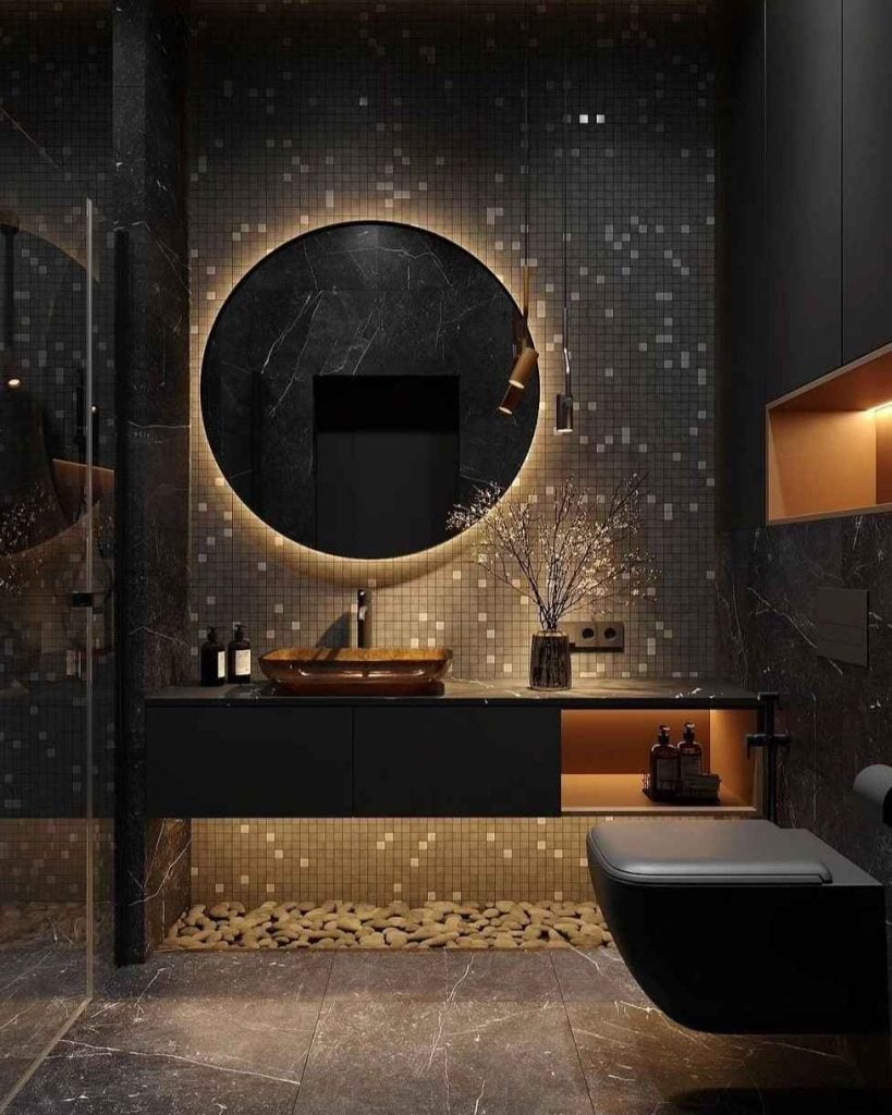Design Tip: Use matte black tiles or fixtures and pair them with subtle gold highlights — like mirror trims or handles.