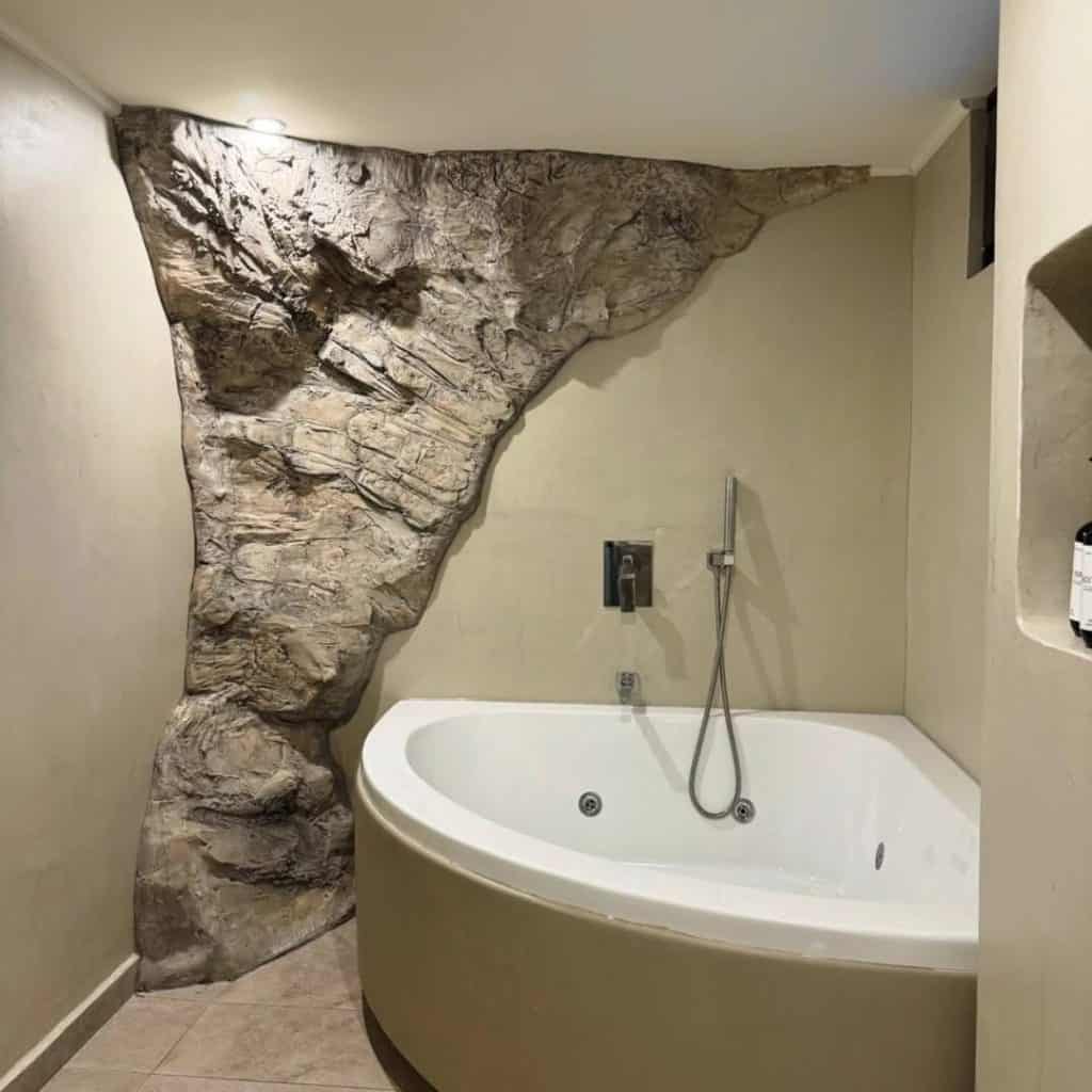 Design Philosophy: Every surface should engage the senses. Rough stone, smooth tile, soft towels — all balanced.