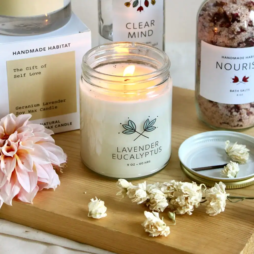Materials: Soy wax, candle wick, small glass jar, essential oils, thermometer, stirring stick.