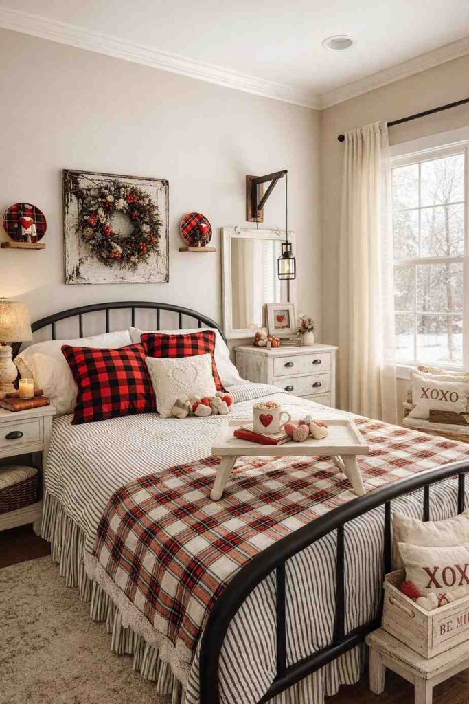 This is probably the most popular Valentine bedroom look for a reason — red and white instantly signal romance. The key is keeping it clean instead of overwhelming.